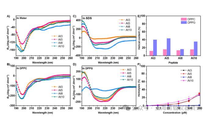 圖2、設(shè)計(jì)肽的二級結(jié)構(gòu)和溶血特性。(A)水、(B)25 mM SDS、(C)兩性離子DPPC SUV(0.25 mg mL-1)和(D)帶負(fù)電荷的DPPG SUV(0.25 mg mL-1)中肽的CD光譜。所有四種肽(At3、At5、At8、At10)在水和DPPC SUV中均呈現(xiàn)無規(guī)卷曲結(jié)構(gòu),而在SDS和DPPG SUV中均采用螺旋結(jié)構(gòu)。肽濃度固定在0.1 mM。所有測量均在室溫下進(jìn)行。(E)DPPC和DPPG SUV中肽的α-螺旋含量。(F)肽的溶血活性。用不同濃度的肽處理人紅細(xì)胞(hRBC)并在37°C下孵育1小時(shí)。然后在OD540nm處測量吸光度。