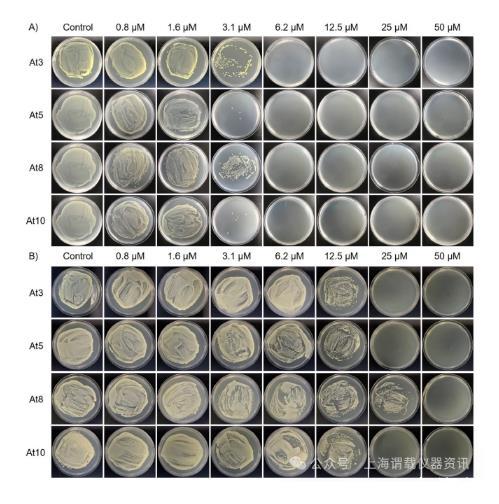 圖1、用于確定(A)大腸桿菌和(B)金黃色葡萄球菌中肽的最低殺菌濃度(MBC)值的細(xì)菌培養(yǎng)物。