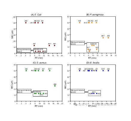 圖3、設(shè)計(jì)的抗菌肽的疏水性由它們的HPLC保留時(shí)間確定,與它們對不同菌株(A)大腸桿菌、(B)銅綠假單胞菌、(C)金黃色葡萄球菌和(D)大腸桿菌的抗菌活性之間的關(guān)系。