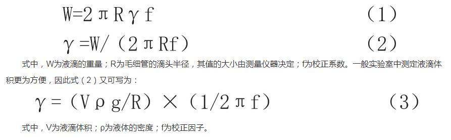 滴體積法的基本原理是這樣的,利用毛細(xì)管滴頭,緩慢往下滴液體,這時(shí)候測量液滴的大小,就能測定液體的表面張力。這是因?yàn)橐后w的表面張力,與從毛細(xì)管滴下的液滴的大小有內(nèi)在關(guān)聯(lián),存在正比關(guān)系,這個(gè)關(guān)系可以用數(shù)學(xué)公式表達(dá):