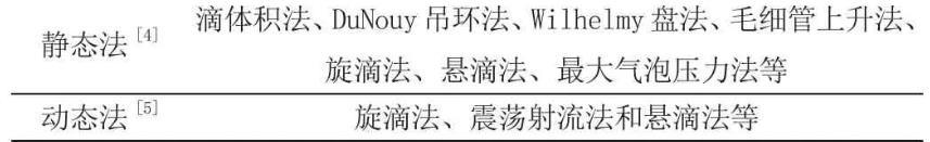 液體表面張力可以通過儀器測定,目前測定方法大體上分為動(dòng)態(tài)法和靜態(tài)法。這兩大類方法下面由于細(xì)分,具體分類如表1。