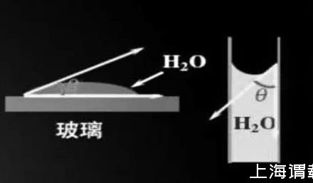 在實(shí)際工作中,通常會(huì)用到接觸角結(jié)合γg-l氣-液界面張力來判斷鋪展過程是否自動(dòng)進(jìn)行。接觸角,是指在固相、液相、氣相這三相的交界點(diǎn),兩個(gè)界面張力(氣-固界面與氣-液界面)之間的夾角,通常用θ表示。如圖1,將水滴滴到玻璃上,接觸角如圖所示。
