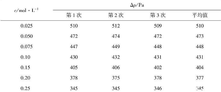 ⑥按照上述方法測定不同濃度正丁醇溶液的Δpmax值。不同溶液測定時須按低濃度到高濃度的次序測定;測定每一樣品時只需要用同樣濃度的溶液淌洗3次即可,并對測量數據進行記錄(例見表1)。