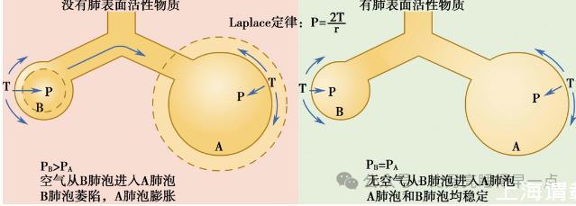 由上述公式可知,在T相同的情況下,肺泡半徑r越大,則肺泡液氣界面的壓強越??;肺泡半徑r越小,則肺泡內液-氣界面的壓強越大。