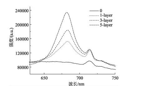 圖4是石莼類囊體膜LB膜在納米ZnO上的室溫熒光發(fā)射光譜,類囊體膜的最大熒光發(fā)射峰在683 nm,隨著類囊體膜在ZnO上吸附層數(shù)的增加熒光發(fā)射強度增大。菠菜類囊體膜的熒光發(fā)射光譜表現(xiàn)出相同的趨勢(結果未顯示)。