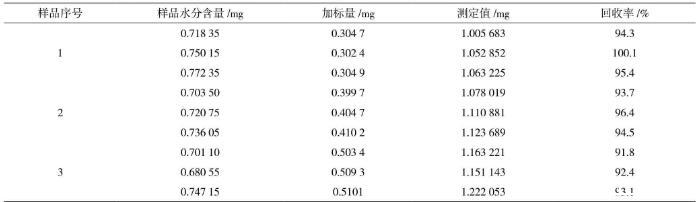 在樣品中加入精密稱取的標(biāo)準(zhǔn)水加標(biāo)水平分別為0.3 mg、0.4 mg、0.5 mg,在150℃加熱10 min的測(cè)定條件下,采用滴定度為1 mg/mL的費(fèi)休氏試劑,每個(gè)加標(biāo)水平重復(fù)測(cè)定3次,經(jīng)測(cè)定,加標(biāo)回收率在91.8%~100.1%,結(jié)果見表6。