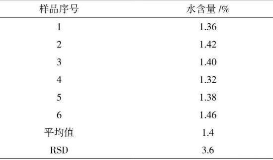 在150℃加熱10 min的測(cè)定條件下,采用滴定度為1 mg/mL的費(fèi)休氏試劑,用卡氏干燥爐自動(dòng)進(jìn)樣法測(cè)定樣品中水分含量,樣品測(cè)定6次,計(jì)算6次結(jié)果的相對(duì)標(biāo)準(zhǔn)偏差(RSD%)數(shù)據(jù)見表5。結(jié)果表明測(cè)定結(jié)果具有良好的重復(fù)性。