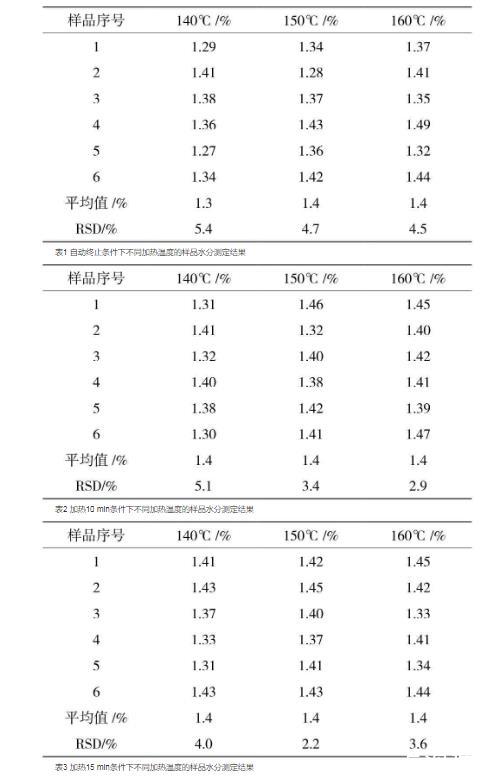 加熱爐樣品轉(zhuǎn)換器的溫度直接影響樣品中水分的蒸發(fā);終止條件也是影響測(cè)定結(jié)果的關(guān)鍵因素,加熱時(shí)間太短,樣品中的水分未完全蒸發(fā),導(dǎo)致測(cè)定結(jié)果偏低;加熱時(shí)間太長(zhǎng),則延長(zhǎng)了測(cè)定時(shí)間,環(huán)境因素的影響變大,因此需要選擇合適的終止時(shí)間和加熱溫度[3]。試驗(yàn)分別選擇自動(dòng)終止、加熱10 min和加熱15 min作為終止條件,在不同的終止條件下分別選擇了140、150、160℃作為加熱溫度,每種條件下連續(xù)進(jìn)樣6次。結(jié)果見表1、表2、表3。結(jié)果表明,當(dāng)選擇自動(dòng)終止條件時(shí),三個(gè)加熱溫度的樣品結(jié)果的RSD相對(duì)較大;當(dāng)選擇10 min和15 min作為終止條件時(shí),加熱溫度為150℃和160℃時(shí),樣品結(jié)果的差異較小。因此選擇加熱溫度150℃,終止條件為10 min比較合適。