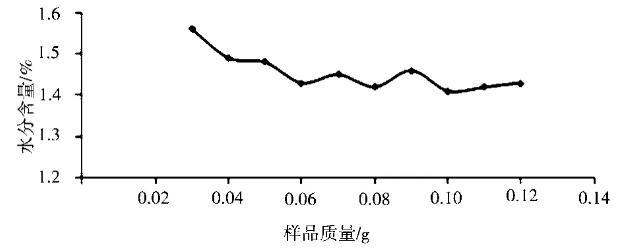在150℃加熱10 min的測(cè)定條件下,樣品稱樣量也會(huì)對(duì)測(cè)定結(jié)果有影響[4]。分別稱取0.03g、0.04g、0.05g、0.06g、0.07g、0.08g、0.09 g、0.10g、0.11g、0.12g的樣品質(zhì)量,考察樣品稱樣量對(duì)測(cè)定結(jié)果的影響,結(jié)果見圖1。從圖中可以看出,儀器測(cè)得樣品水分含量隨著加入樣品質(zhì)量的增大逐漸趨于穩(wěn)定,當(dāng)單次加入的樣品質(zhì)量較小時(shí),測(cè)得結(jié)果偏高[5]。稱量樣品質(zhì)量在50~120 mg結(jié)果無明顯差異。