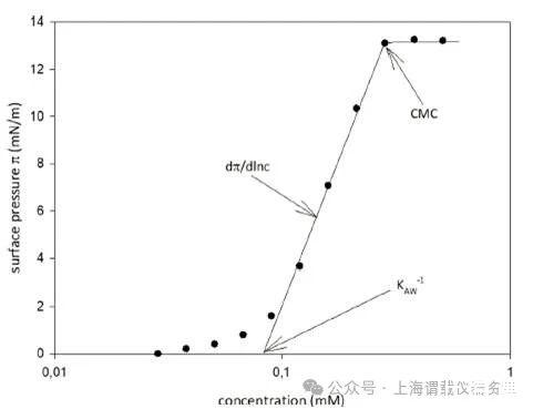 圖1、表面活性分析(SAP):增加一種兩親性物質的濃度會導致更高的表面壓力(π)。Kaw?1是空氣-水分配系數(shù),CMC是臨界膠束濃度,dπ/dlnc斜率和描述物質在接口的橫截面積。