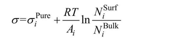 式中:σipure表示純組元和Al2O3)的表面張力;Ai為純組元i的摩爾表面積,其中L為校正因子,熔渣中設為1.091;N0為阿伏加德羅常數(shù),Vi為組元i的摩爾體積);R和T分別表示摩爾氣體常數(shù)和絕對溫度;為組元i在表面相或體相的質(zhì)量作用濃度。