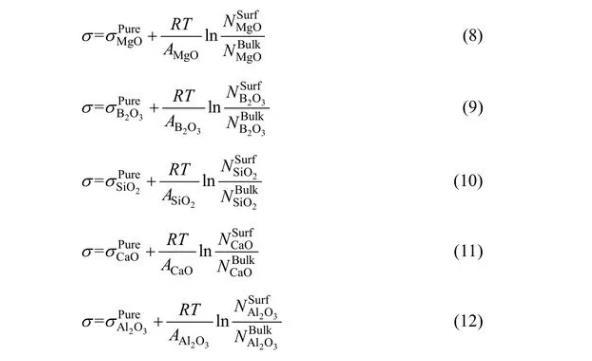 對于MgO-B2O3-SiO2-CaO-Al2O3體系,依據(jù)Bulter方程,其表面張力可以分別表示為