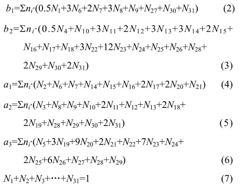 所有組元總平衡摩爾數(shù)表示為∑ni。各組元作用濃度表達式為: