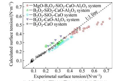 圖1 MgO-B2O3-SiO2-CaO-Al2O3體系相關渣系表面張力計算值與文獻實驗數(shù)據(jù)的比較