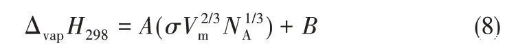 2006年,Kabo等[40]總結(jié)了摩爾體積、表面張力和摩爾汽化焓的關(guān)系,得出汽化焓的相關(guān)方程