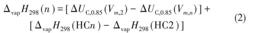 式中,ΔUC,0.85(Vm,n)是摩爾體積為Vm,n時(shí)的庫(kù)侖能;Vm(HCn)和ΔvapH298(HCn)分別為直鏈烴CnH2n+2的摩爾體積和汽化熱;Vm,n為[Cnmim][Tf2N]的摩爾體積。