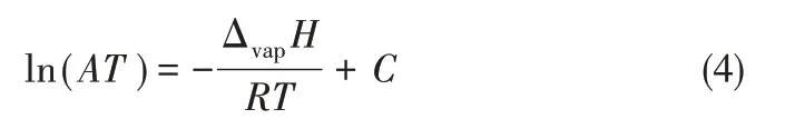 將ln(AT)對(duì)1/T作圖,回歸線(xiàn)性方程,從斜率可以得出ILs的汽化焓數(shù)據(jù)。