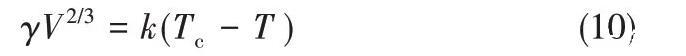 式中,γ是樣品在溫度T下測得的表面張力;V是液體的摩爾體積;Tc是臨界溫度;k是經(jīng)驗常數(shù)。將實驗值γ和V2/3的乘積相對于熱力學(xué)溫度T進(jìn)行線性回歸,并獲得一條直線,從直線和截距的斜率,可以得到k和Tc的值。對于大部分有機液體來說,k大約為2.1×10-7J·K-1,而對于簡單熔鹽,k比較小,NaCl的k≈10-7J·K-1。