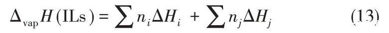 2008年,Verevkin[71]開發(fā)了一種基于經(jīng)驗公式的簡單相加法來計算ILs的蒸發(fā)焓,該焓被分解為構(gòu)成元素的主要成分和輔助成分的校正(基于結(jié)構(gòu)上的特殊性,例如CF3基團(tuán)或環(huán)狀結(jié)構(gòu)的存在)