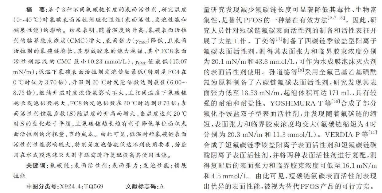 結果表明,隨著溫度的升高,氟碳表面活性劑的臨界膠束濃度(CMC)增大,表面張力(γCMC)降低,且表面活性劑的氟碳鏈越長,其形成膠束的能力越強,其中FC8表面活性劑溶液的CMC最小(0.23 mmol/L),γCMC值最低(15.07mN/m);低溫下氟碳表面活性劑發泡倍數最低(特別是FC4在0℃時僅為3.70倍),升溫到20℃時發泡倍數達到最佳(6.00——8.73倍),繼續升溫對發泡倍數影響不大,且相同溫度下氟碳鏈越長發泡倍數越大,FC8的發泡倍數在20℃時達到8.73倍;表面活性劑鋪展系數(S)隨溫度的升高而增大,當溫度達到20℃時S的變化趨于平緩,且氟碳鏈越長越有利于降低單位面積表面活性劑的消耗量,節約成本。