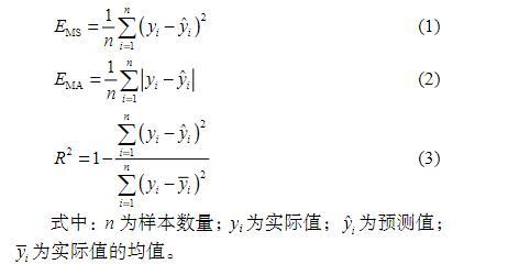 按照8∶2的比例將實(shí)驗(yàn)數(shù)據(jù)劃分為訓(xùn)練集和測(cè)試集,對(duì)每個(gè)模型進(jìn)行訓(xùn)練,并在測(cè)試集上進(jìn)行驗(yàn)證。這里選用3種常用于回歸任務(wù)的評(píng)價(jià)指標(biāo):均方誤差(MSE)、平均絕對(duì)誤差(MAE)和決定系數(shù)(2)。MSE和MAE可以衡量預(yù)測(cè)值與真實(shí)值之間的誤差,數(shù)值越小表示模型預(yù)測(cè)的越準(zhǔn)確;2度量模型擬合數(shù)據(jù)的程度,取值范圍在0到1之間,越接近1表示模型對(duì)數(shù)據(jù)的擬合程度越好。這3個(gè)評(píng)價(jià)指標(biāo)的計(jì)算公式如下所示:
