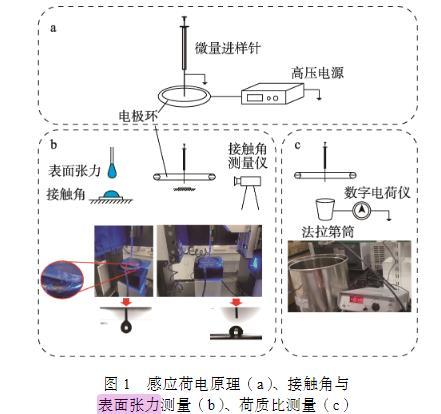 圖1感應(yīng)荷電原理(a)、接觸角與表面張力測(cè)量(b)、荷質(zhì)比測(cè)量(c)