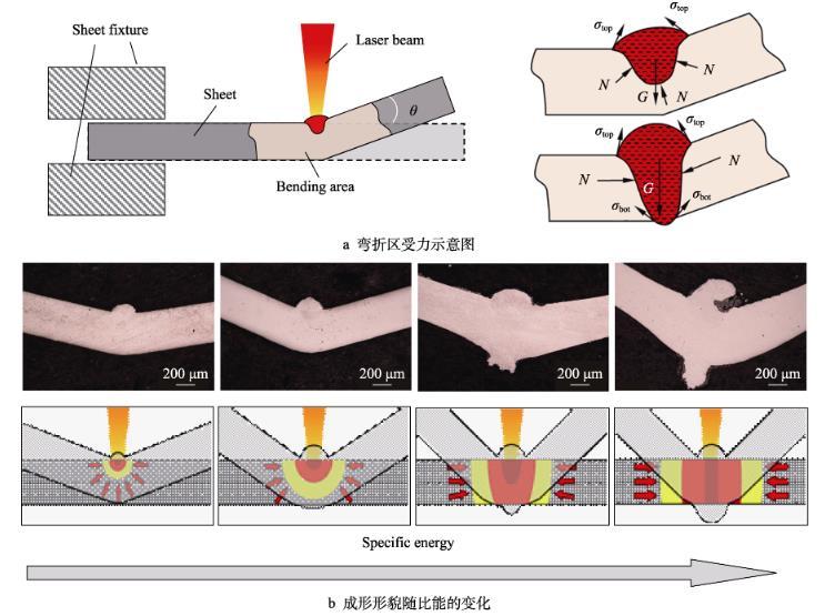 通過觀察激光熱應力成形過程中彎折處的形貌發現,激光熱輸入、彎曲角度和成形機制會影響彎折區材料表面的擠壓、熔化、流動和凝固過程,以及材料內部的溫度梯度和界面表面張力,這些影響導致彎折區域的輪廓形貌、粗糙度、顯微組織、硬度分布發生變化。在激光熱應力成形過程中,熔池的受力情況如圖1a所示。一方面,當比能較小且熔凝區僅存在金屬板上表面時,薄板彎折處的增厚主要受到左右兩側和下側冷端材料的約束作用,通過作用于上側材料,且上表面局部熔化的材料在頂端表面張力的作用下,形成了頂部凸起的形貌。同時,由于激光瞬態作用時間較短,熔融材料在激光掃描結束后快速凝固,并在掃描次數逐漸增加的過程中形成連續隆起的形貌,在彎折處形貌演變過程中粗糙度逐漸增大。在高比能下,薄板彎折處材料的熔化凝固和塑性變形受到左右兩側材料的橫向約束,該區域在左右兩側材料的擠壓下增厚。