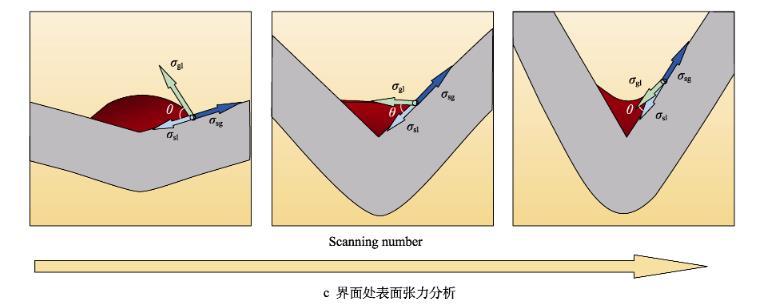 另一方面,材料內部的溫度梯度和界面表面張力亦會導致彎折區的形貌發生改變。通過觀測不同比能和掃描次數下薄板彎折區的成形狀態發現,在高比能、多次掃描下,彎折區界面的形貌由凸向凹演變,潤濕角顯著降低,如圖1c所示。可見,比能和掃描次數是造成形貌發生變化的重要因素,最終通過影響熔池的表面張力和溫度梯度,進而影響彎折區的宏觀形貌。