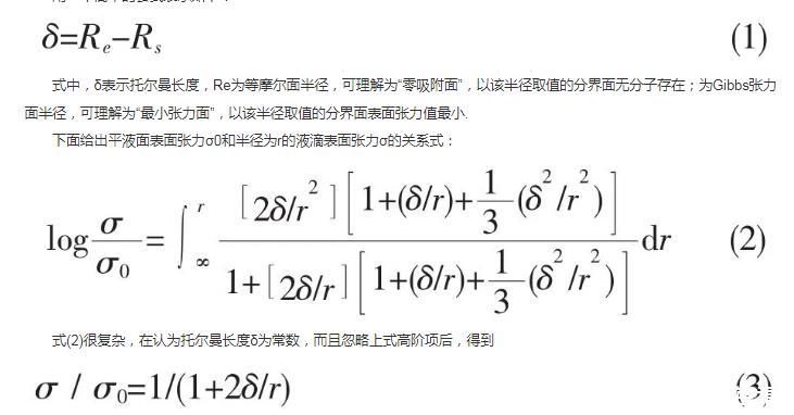 下面給出平液面表面張力σ0和半徑為r的液滴表面張力σ的關(guān)系式: