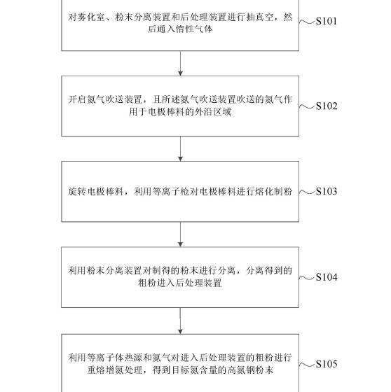 一種制備高氮鋼粉末的方法,利用以上實(shí)施例中的制備高氮鋼粉末的裝置進(jìn)行高氮鋼粉末制備,請參考圖2,所述方法包括以下步驟: