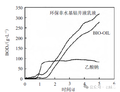 圖1 BIO-OIL、乙酸鈉溶液、環(huán)保非水基鉆井液乳液BOD5隨測試時間的變化