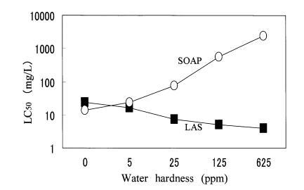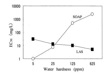 圖 5 水硬度對(duì)急性毒性的影響 LAS 和 SOAP 到 Daphnia Magna 的 4 鹽混合 水。