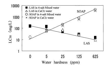 圖 4 水硬度對(duì)急性毒性的影響 LAS 和 SOAP 到 4-鹽混合中的 Orysis Latipes 水。