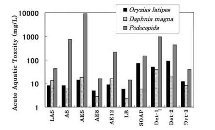 7 種表面活性劑和 3 種商品化劑的急性毒性 使用 3 種測(cè)試生物測(cè)量清潔劑: oryzias latipes、daphnia magna 和 podocipida。 結(jié)果 如圖 1 所示。在所有情況下,EC50 和/或 LC50 podocopida 高于 oryzias latipes 和 daphnia magna。 SOAP 和 LB 的毒性值 oryzias latipes 高于 daphnia magna, 而其他 5 種表面活性劑的毒性值 oryzias latipes 或 daphnia magna 幾乎相等。 這 表面活性劑可分為三類(lèi); 低毒 組(AES、SOAP 和 AE12),中毒性組(LAS 和 AS) 和高毒組 (AE8 和 LB)。