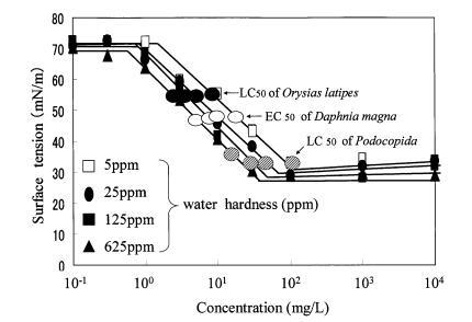 圖 10 水硬度對(duì)表面張力的影響 AE 和有毒表面張力值的曲線 水蚤麥格納。