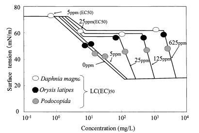 SOAP 的毒性值繪制在圖 8 中的表面張力曲線上。 oryzias latipes 和 podociida 可以確定為大約 55 分別為 mN/m 和 40-45 mN/m。 兩個(gè)范圍的gtox 然而,獲得了 daphnia magna 的值:73 mN/m 在水硬度為 5 ppm 和大約 60 mN/m,水硬度為 25-625 ppm。