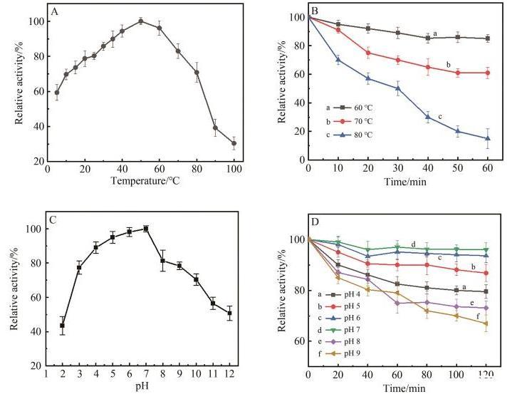 圖5C是不同pH值條件下ME-O5的相對活性,結果表明,ME-O5的最適pH=7.0。當pH值在2.0~7.0時,隨著pH值增大,ME-O5的相對酶活力增加,在pH=2.0時仍能保持43%的相對酶活力;當pH值在7.0~12.0時,隨著pH值的繼續增大,ME-O5的相對酶活力逐漸降低。但pH值在3.0~9.0范圍內,ME-O5均能夠維持70%以上的酶活力,具有一定的pH值適應性和較寬的pH值耐受范圍。