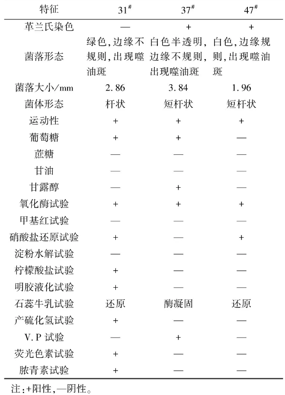 對篩選所得菌株進行常規(guī)生理生化特性實驗,結(jié)果如表2所示。根據(jù)表2所示結(jié)果和《伯杰氏(Berge)菌種鑒定手冊》的描述,可鑒定菌株31#為假單孢屬,菌株37#、47#均為芽孢桿菌屬。