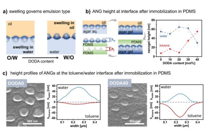 圖1展示了制備兩親性納米凝膠(ANG)的合成方案,以及不同ANG的性質(zhì)。通過在反應(yīng)性前體顆粒上功能化混合親水(HPA)和親油(DODA)胺,制備了具有不同網(wǎng)絡(luò)疏水性的ANG(圖1a)。動(dòng)態(tài)光散射(DLS)數(shù)據(jù)顯示了不同ANG的流體動(dòng)力學(xué)直徑,證明ANG保持了相似的膠體性質(zhì)(圖1b)。非交聯(lián)DODA0至DODA40聚合物膜的接觸角表明,ANG的疏水性隨著DODA含量的增加而增加(圖1d)。綜上所述,圖1展示了通過后功能化反應(yīng),成功制備了具有可調(diào)網(wǎng)絡(luò)疏水性但保持相似膠體性質(zhì)的兩親性納米凝膠庫,為系統(tǒng)研究網(wǎng)絡(luò)疏水性對乳液穩(wěn)定性的影響提供了基礎(chǔ)。