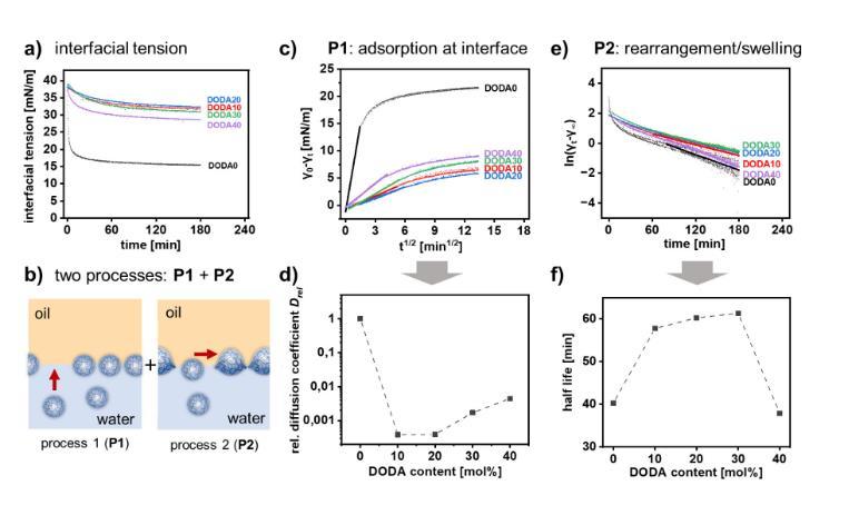 圖3展示了不同疏水性納米凝膠(ANGs)在甲苯/水界面張力(IFT)方面的研究結(jié)果。隨著ANGs的疏水性增加,甲苯/水界面張力隨時(shí)間非線性降低,但不同ANGs的降低速率不同(圖3a)。IFT的降低分為兩個(gè)階段:初始快速降低(P1)和隨后緩慢松弛到平衡狀態(tài)(P2)(圖3b)。通過分析P1階段,可以得到描述ANGs界面吸附速率的擴(kuò)散系數(shù)D(圖3c)。不同ANGs的相對擴(kuò)散系數(shù)Drel(相對于DODA0)與ANGs的DODA含量相關(guān):親水的DODA0和疏水的DODA40顯示出最快的界面吸附速率(圖3d)。通過分析P2階段,可以得到描述ANGs重新排列速率的半衰期(圖3e)。半衰期與ANGs的DODA含量相關(guān):親水的DODA0和疏水的DODA40顯示出最快的重新排列速率(圖3f)。