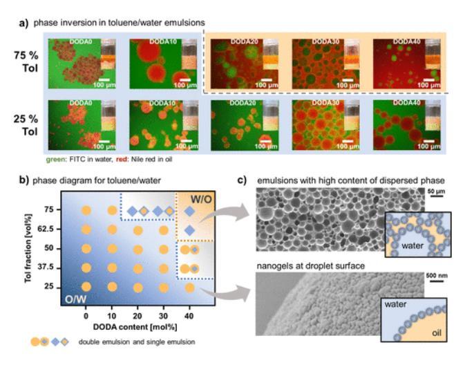 圖2展示了使用不同親水性納米凝膠(DODA含量)制備的甲苯/水Pickering乳液的類型。具體來說,圖2a通過熒光顯微鏡圖像和照片顯示了不同DODA含量下的甲苯/水乳液,其中25 vol%的甲苯觀察到O/W乳液,而在75 vol%的甲苯中,從DODA10到DODA20觀察到從O/W到W/O的相變。圖2b總結(jié)了甲苯/水乳液系統(tǒng)中乳液類型對納米凝膠的DODA含量和乳液的油相體積分?jǐn)?shù)的依賴性。圖2c通過SEM圖像展示了高分散相含量(DODA40,Tol-75)乳液和納米凝膠(DODA20,Tol-25)在粒子/液滴表面的存在。