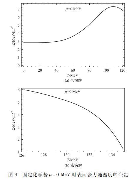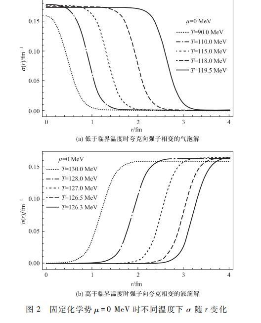 值得指出的是,對于液滴解,由圖1可以看出在更高溫度時,在σ=σv處的極小值將會消失,即偽真空消失。此時全空間將是均勻的夸克相,相變已經(jīng)完成,液滴解也隨之消失,所以在更高溫度區(qū)域不存在液滴解。