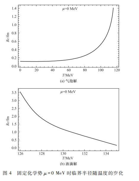反過來,圖2(b)所示的液滴解中同樣可做類似討論。液滴解曲線的拐點處也可以粗略看做液滴的臨界半徑,隨著溫度的逐漸降低而靠近相變臨界溫度,液滴解的半徑逐漸增加,同樣在接近臨界溫度處液滴解隨溫度的變化明顯大于遠離臨界溫度處時的變化。這就是說,在強子背景中產(chǎn)生了許多大小不一的夸克液滴,當溫度靠近臨界溫度時,由于此時對應液滴的臨界半徑較大,因此許多隨機產(chǎn)生的液滴難以達到臨界液滴的半徑就在產(chǎn)生后在表面張力作用下收縮消失了;但當溫度逐漸升高,液滴的臨界半徑減小,將會存在越來越多隨機產(chǎn)生的半徑大于臨界半徑的液滴,這些液滴發(fā)生膨脹并彼此間相互合并最終充滿整個空間完成相變過程。