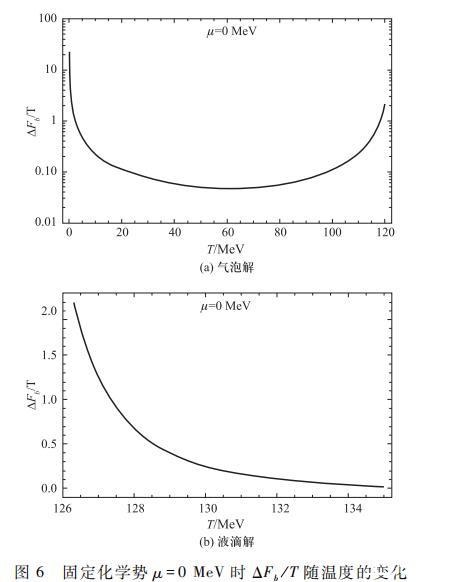 對于液滴解,ΔFb/T的值在靠近臨界溫度時也是迅速增加,而當溫度遠離臨界溫度時逐漸減小。造成這兩者變化的主要不同在于亞穩(wěn)態(tài)是否會消失,對于氣泡解從圖1有效勢的變化可以看出即使到零溫,亞穩(wěn)態(tài)仍然不會消失,所以ΔFb/T的值會在接近零溫時快速變大并趨于發(fā)散,但是從描述相變的角度來看遠離臨界溫度的氣泡解已經(jīng)不再具有真實的物理意義。這與以往文獻中對于此模型研究的數(shù)值結(jié)果是一致的。而對于液滴解情形有效勢亞穩(wěn)態(tài)會在溫度升高到Tsp=142.8 MeV時消失,Tsp這個溫度稱為亞穩(wěn)態(tài)分解(Spinodal)溫度,此時液滴解不再存在,ΔFb/T的值變?yōu)?.