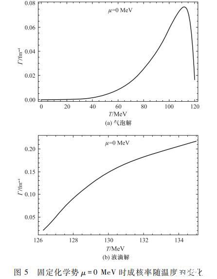 特別需要說明的是在臨界溫度附近,當式(17)中的指數(shù)部分ΔFb/T≌1時對應的溫度在一級相變的過程中具有重要意義,其標示了亞穩(wěn)相真正向穩(wěn)定相發(fā)生實際轉(zhuǎn)變的開始。以氣泡解為例,當ΔFb/T≌1時,Γ的指數(shù)項變?yōu)?/e,此時對應的溫度為T1=118.1 MeV,這說明在Tc=119.8 MeV和T1=118.1 MeV之間系統(tǒng)能夠在相對長的時間內(nèi)保持在夸克相亞穩(wěn)態(tài)。但當溫度進一步降低時,夸克相亞穩(wěn)態(tài)才會實際上通過氣泡動力學過程快速地向穩(wěn)定強子相轉(zhuǎn)變,即液相背景中快速產(chǎn)生強子氣泡并迅速膨脹合并從而完成相變過程。液滴解中的物理過程完全類似,液滴解在T2=127.3 MeV時有ΔFb/T≌1,表明在Tc=119.8 MeV和T2=127.3 MeV之間系統(tǒng)能夠在相對長的時間內(nèi)保持在強子相亞穩(wěn)態(tài),只有當溫度進一步升高到超過T2=127.3 MeV時,系統(tǒng)將通過液滴成核的動力學過程快速向夸克相轉(zhuǎn)變。當溫度升高至Tsp=142.8 MeV時,強子的亞穩(wěn)態(tài)真空完全消失,如果此時相變還沒有全部完成,那么系統(tǒng)會發(fā)生劇烈的強子相到夸克相的轉(zhuǎn)變過程。