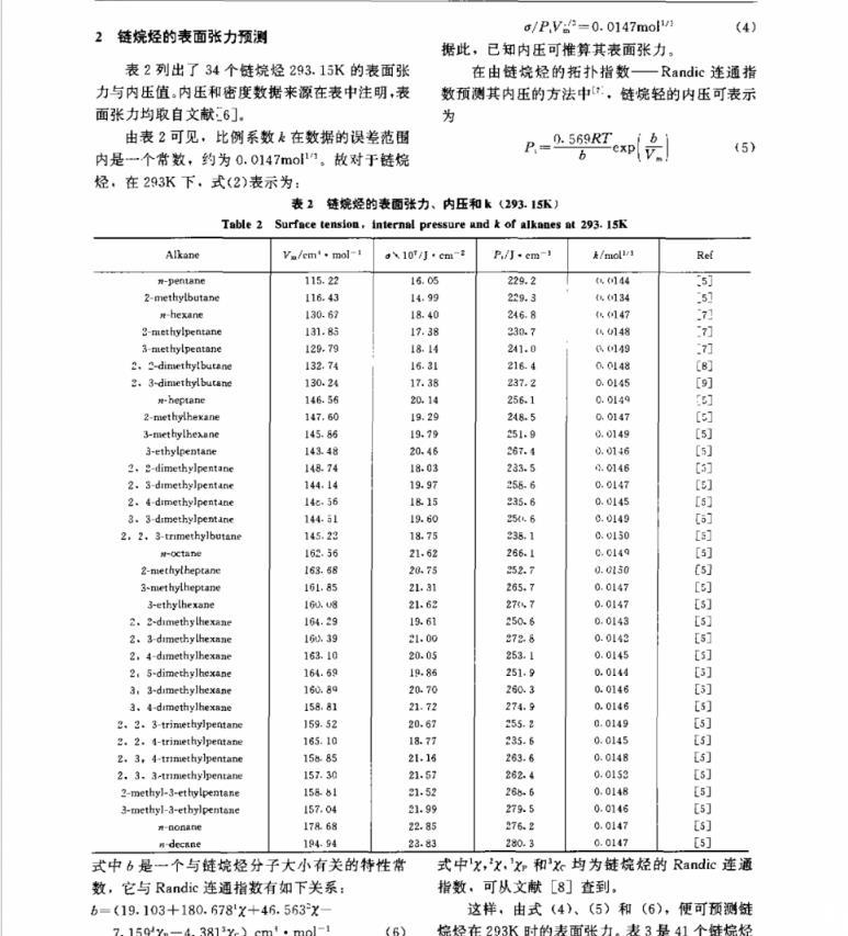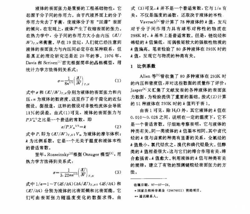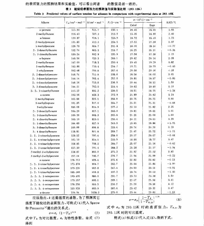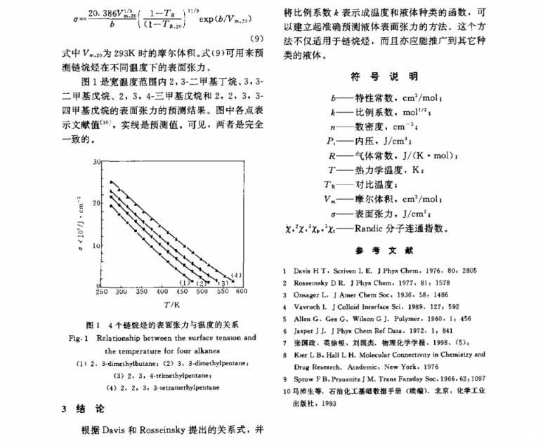 對Davis和Rosseinsky提出的關(guān)系檢驗表明,液體的表面張力σ與P1Vm1/3之比不僅取決于溫度,還與液體的種類有關(guān),據(jù)此,建立了一個能由鏈烷烴的分子結(jié)構(gòu)準確預測其表面張力的方法。