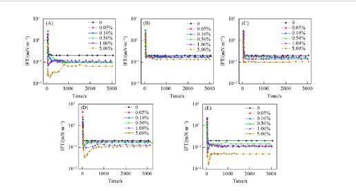 從圖4(A),(D)和(E)可見,A,A3和A4的DIFTs變化趨勢與濃度密切相關。隨著瀝青質及其亞組分濃度的逐漸增加,DIFTs曲線由“L”型轉變為“V”型。這一有趣的結果是由活性分子在界面上呈現不同的排列方式引起的。當油相與水相接觸時,水相中的p-S14-4分子和油相中的界面活性分子都迅速擴散到界面并形成混合吸附膜。