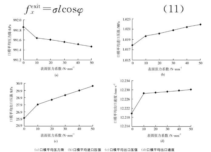 (2)在微擠出中,表面張力系數(shù)越大,擠出脹大越明顯,擠出口模內(nèi)熔體的進(jìn)出口壓強都明顯增大,口模內(nèi)熔體的壓力降略微減小,平均出口速度略微增大,自由表面出口壓力與平均出口速度都明顯減小;