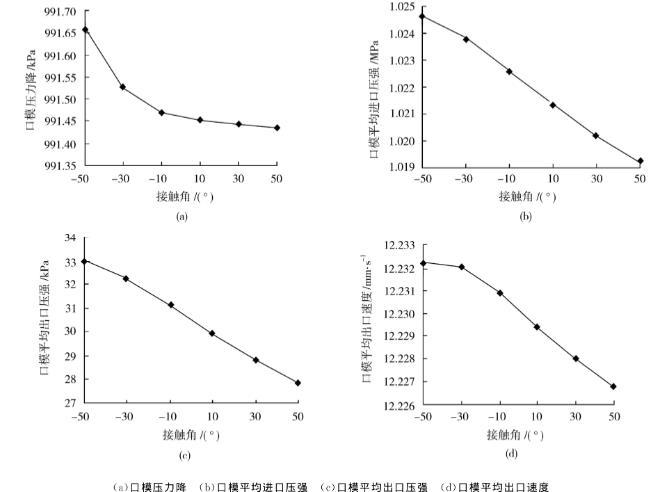 在表面張力系數(shù)為50N/mm不變時,接觸角取值:-50°~50°。得到口模壓力降、口模平均進(jìn)出口壓力、以及口模出口平均速度曲線如圖8所示。由圖8可知,接觸角與口模流場參數(shù)的關(guān)系并不是線性關(guān)系。由圖6可知接觸角θ增大,自由表面擠出脹大比值減小,φ減小,表面張力對口模出口處的軸向分力如式(9)所示,牽引力隨著夾角φ值的減小而增大,使得材料在口模內(nèi)的剪切能量損失減小,因此壓力降減小。所以圖8(a)中口模平均進(jìn)出口壓力降減小。而圖8(b)、(c)中口模內(nèi)熔體進(jìn)出口壓強的減小是因為擠出脹大減小,自由表面對外做功減小,自由表面對口模的阻力減小。圖8(d)中口模平均出口速度減小是因為表面張力對自由表面的徑向分力減小,口模內(nèi)熔體出口徑向速度減小,而熔體軸向速度不變,因此平均速度減小。