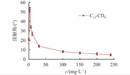 通過(guò)測(cè)試接觸角評(píng)價(jià)兩親性碳點(diǎn)的吸附性能,接觸角測(cè)定依據(jù)標(biāo)準(zhǔn)SY/T 5153—2017《油藏巖石潤(rùn)濕性測(cè)定方法》。具體實(shí)驗(yàn)步驟如下:將玻璃板浸泡在現(xiàn)配的食人魚(yú)溶液(濃硫酸∶雙氧水=3∶1)中1 min,進(jìn)行表面羥基化的親水處理,再洗凈烘干;將玻璃板下半部浸泡在表面活性劑溶液中,上半部懸空,讓溶液保持?jǐn)嚢锠顟B(tài),浸泡12 h后取出,自然晾干。利用光學(xué)接觸角測(cè)量?jī)x(DSA100,Krüss,德國(guó))測(cè)定表面活性劑溶液浸泡前后水滴在玻璃板上的靜態(tài)接觸角。玻璃的主要成分為硅酸鹽,因此可用玻璃板模擬硅酸鹽顆粒表面。通過(guò)測(cè)定玻璃板水滴靜態(tài)接觸角研究C12-CDS潤(rùn)滑劑在玻璃表面的吸附性能,實(shí)驗(yàn)結(jié)果見(jiàn)圖3。